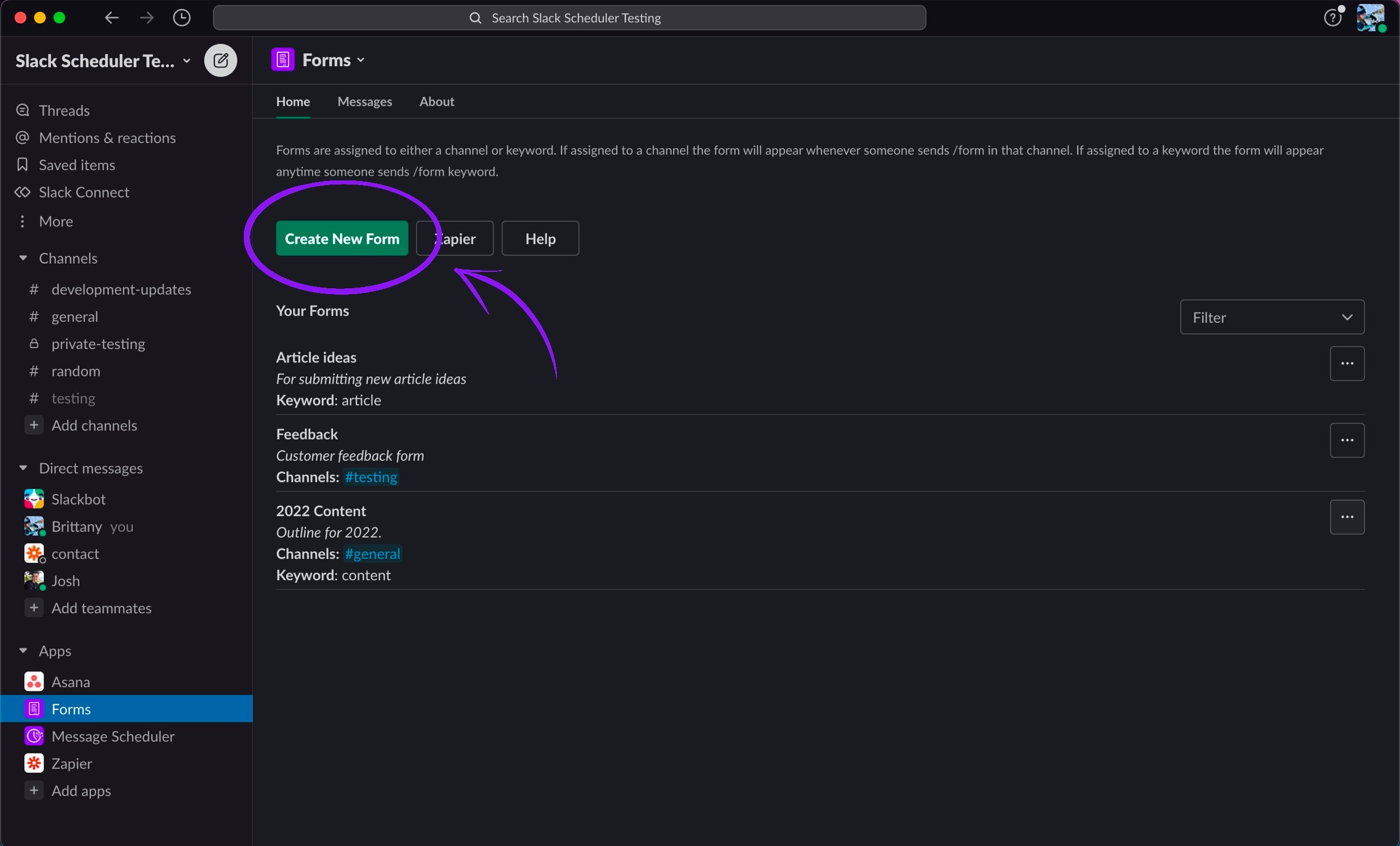 You can see it in your "Apps" sidebar, or search in Slack (CMD + K) for "Forms"