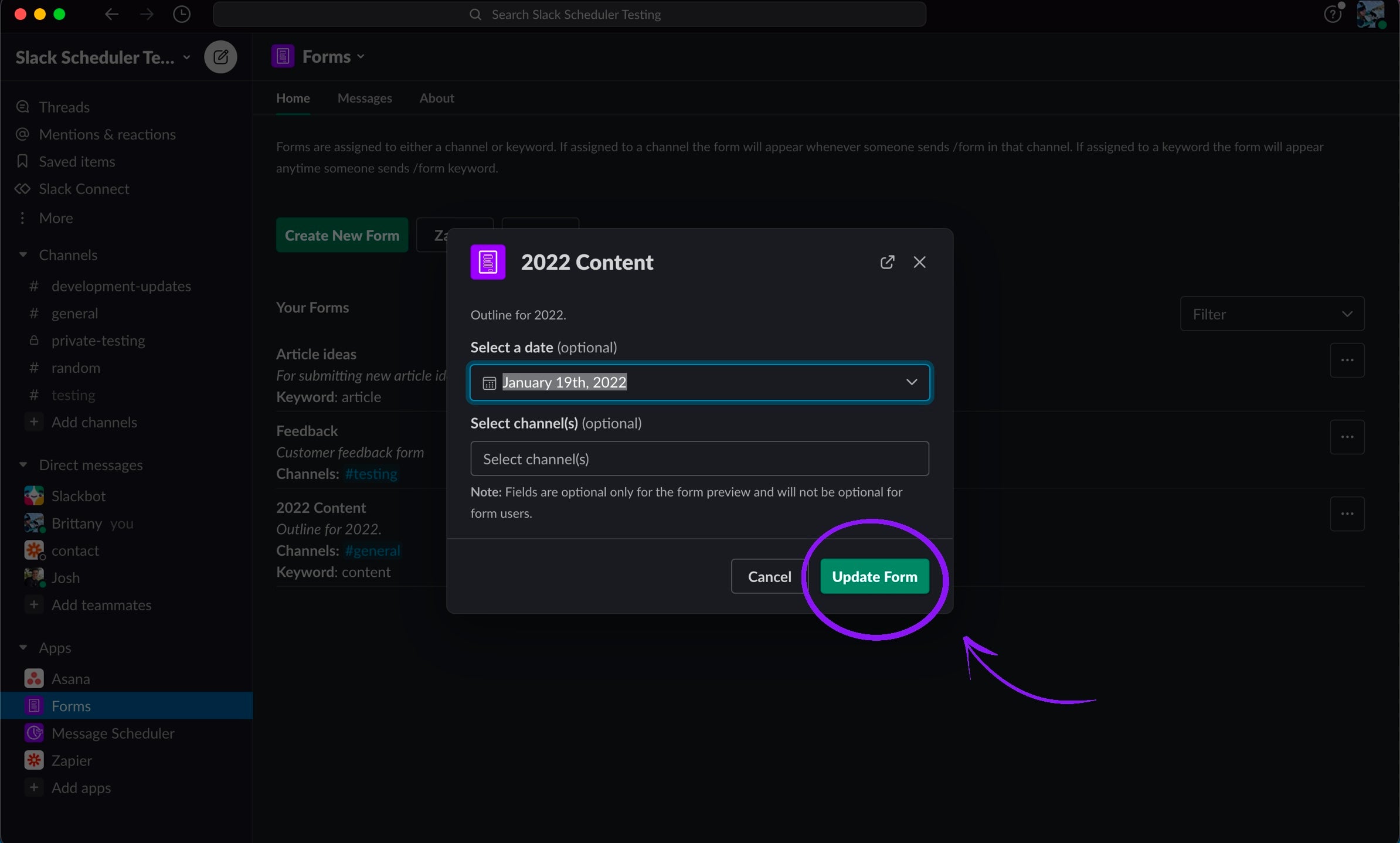 1. Go to the 'Apps' drop down menu on the left side of your Slack workspace - this brings up the Forms dashboard.